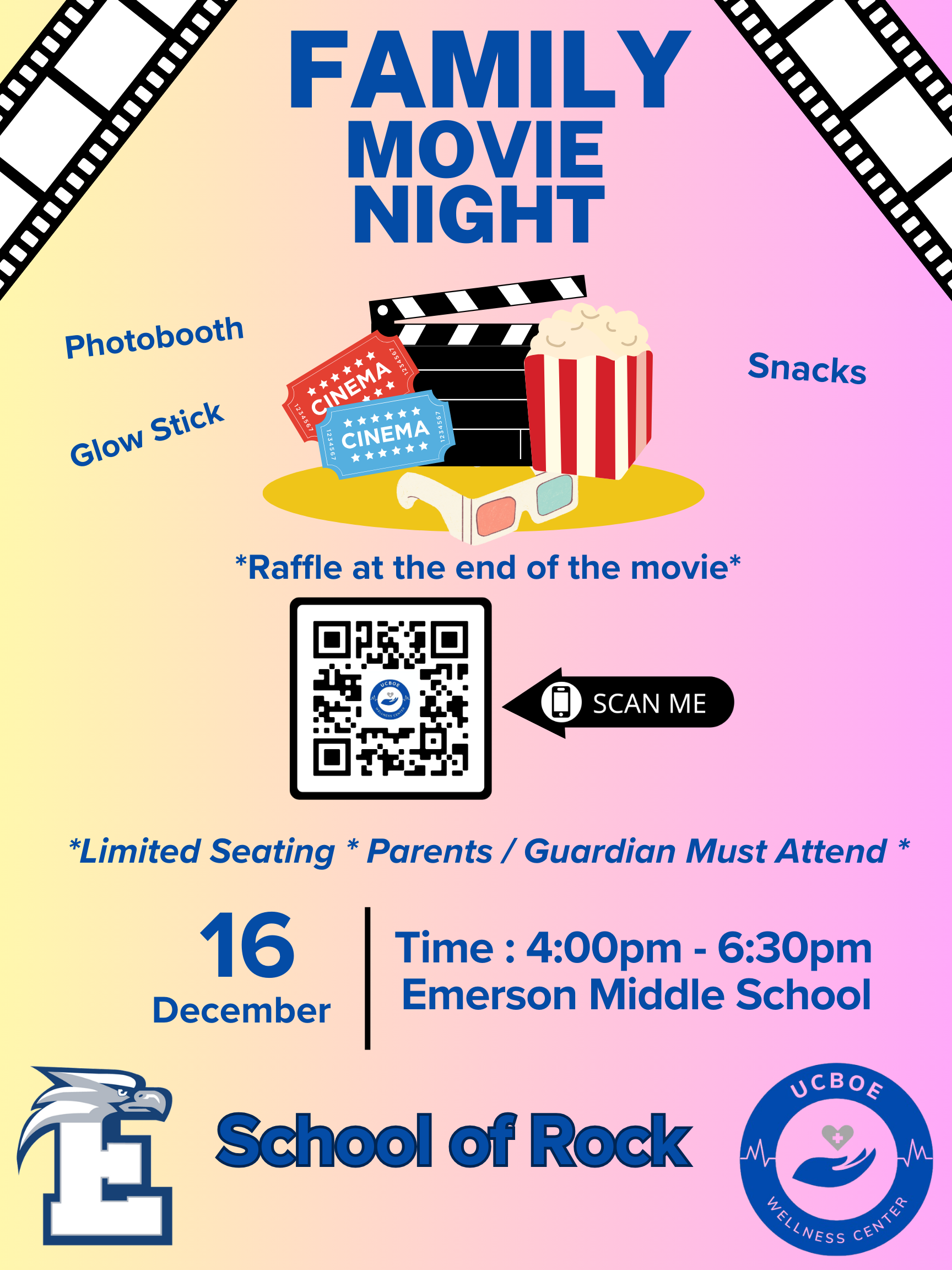 Estamos muy contentos de invitar a nuestros estudiantes y familias de Emerson a nuestra primera noche de cine familiar el lunes 16 de diciembre de 2024. Escanee el código QR en el folleto para registrarse. Esperamos verlos pronto.