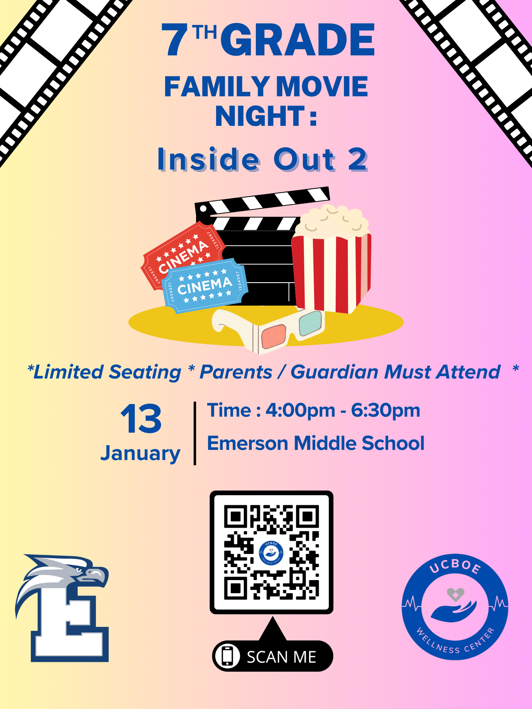 Estamos muy contentos de invitar a nuestros estudiantes y familias del 7mo grado de la escuela intermedia Emerson a nuestra noche de cine familiar el lunes 13 de enero de 2025. Escanee el código QR en el folleto para registrarse. Esperamos verlos pronto.